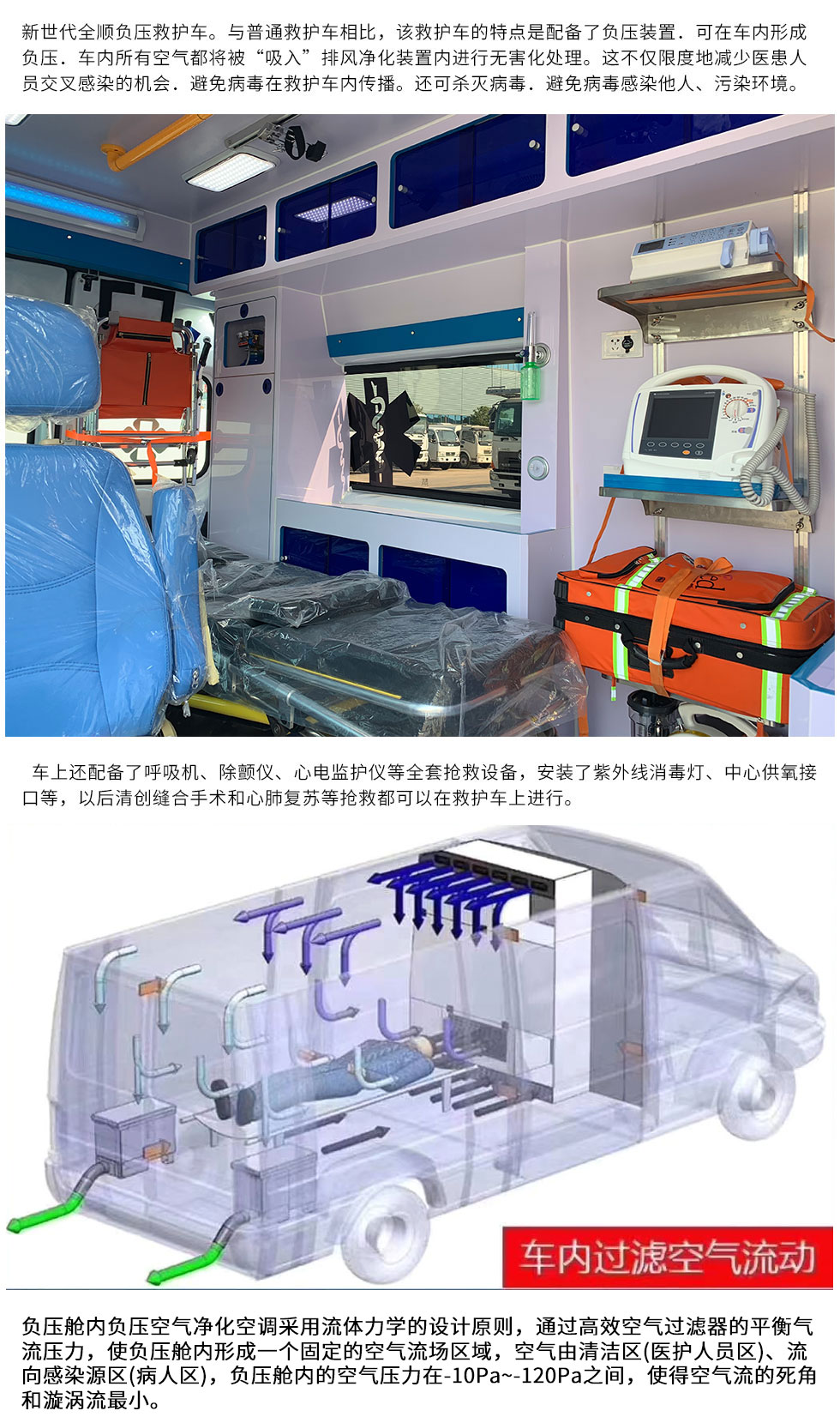 | 2、車載設(shè)備選配:急診箱(內(nèi)外科),設(shè)備掛架,醫(yī)療設(shè)備(呼吸機(jī),心電圖,除顫儀,輸液泵,分體式負(fù)壓吸引器/便攜式吸引器); |