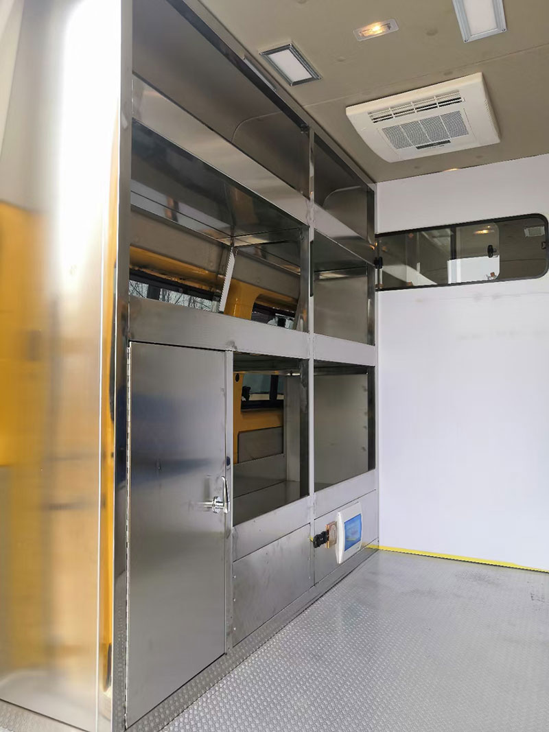 5-9人座工程搶修車_福特V348礦山應(yīng)急氣防車工程搶修車上裝配置:礦山應(yīng)急氣防車的總體結(jié)構(gòu)為駕駛室和艙體、車體。前頂安裝警燈凸臺、長排爆閃警燈,左右兩側(cè)頂藍(lán)色方形LED警燈和白色方形LED警燈,藍(lán)白警燈成對排列,尾門頂部安裝藍(lán)色爆閃燈能夠有效警示。艙體右側(cè)折疊椅的左側(cè)設(shè)有器材骨架Ⅱ,器材骨架Ⅱ后側(cè)配備滅火器。座椅包裹性強(qiáng),用料也挺扎實(shí)的,坐起來很舒服。長排燈、外場照明燈、設(shè)備天線、爆閃燈安裝在車的頂部。外層鋪蓋一層阻燃金屬布,防火性更好,不便于氧化,內(nèi)飾應(yīng)用1.2mm厚網(wǎng)孔板。有助于提高發(fā)動機(jī)的冷卻條件和汽車行駛穩(wěn)定性,車輛內(nèi)部具有極佳的通風(fēng)。