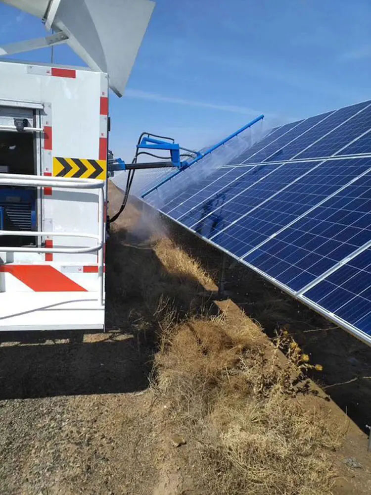 多利卡D9_8方太陽能光伏清洗車高壓清洗車,它每小時能夠清潔8-10公里的光伏板。一車多用,不光可以清洗太陽能光伏板,還可以清洗隧道里面墻壁上的灰塵。這款車維護(hù)成本低、工作效率高、節(jié)能降耗等優(yōu)點(diǎn),深受用戶喜愛。進(jìn)水系統(tǒng)有自動電加熱系統(tǒng),水箱有保溫加熱功能,升降臂可360度旋轉(zhuǎn)。配備的有能伸縮的自動感應(yīng)裝置,如果遇到光伏板不平的時候,也能良好的完成清洗工作。安裝的知名高壓水泵,在提高工作效率的同時,還能夠節(jié)約用水,同樣體積的水的工作時間更長。