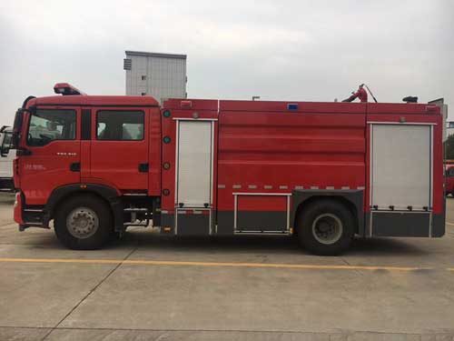 豪沃T5G8噸泡沫消防車,動力澎湃、底盤扎實耐用、機動性強、噴灑射程遠等優(yōu)勢和特點。在結構方面,器材廂布置合理、器材取用更加利于,特制夾具固定裝置使器材存放更加牢固。罐體封閉性好,經(jīng)受住24小時靜水壓測試,無滲漏。器材廂卷簾門使用優(yōu)質(zhì)鋁合金制作,開關順暢靈活,噪音低,密封性好。各種器材在車身上面的放置都很合理,并利用專用的家具固定。內(nèi)部器材架分隔材料均用高強度鋁合金型材,好看大方。為保護水泵及各球閥,在管路中加裝了放余水管路,并分別配有球閥。