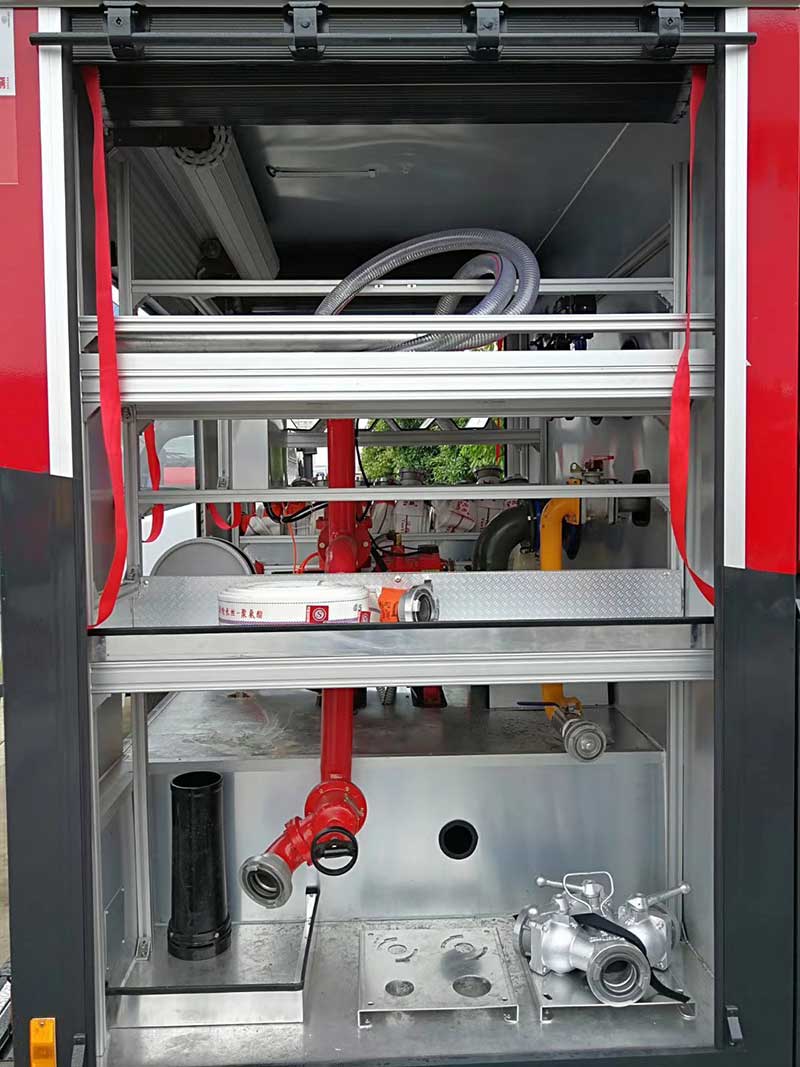 5方水罐消防車_東風(fēng)多利卡D7雙排水罐消防車,車輛尾部安裝可折疊式爬梯。器材箱使用引進(jìn)歐洲技術(shù)生產(chǎn)的鋁合金型材內(nèi)藏式塔接技術(shù)制造,全卯接結(jié)構(gòu)。全車兩側(cè)上方各配有2個(gè)紅藍(lán)爆閃燈及2個(gè)側(cè)照明燈。載液罐體為優(yōu)質(zhì)碳鋼,與底盤選取彈性連接。器材箱內(nèi)設(shè)置有儲(chǔ)物盒,可以放置一些小型工具。駕乘室后部設(shè)置的器材箱安裝有鋁合金卷簾門,內(nèi)設(shè)有照明,物品拿取利于。