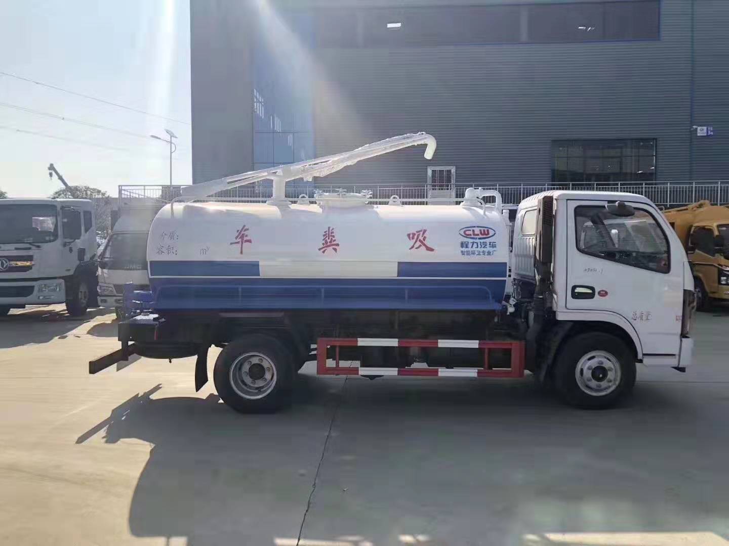 上裝配置:罐體實際容積5.4立方,專用部分由取力器、傳動軸、真空吸糞泵、水氣分離器、油氣分離器、多路換向閥、吊桿、糞罐、放糞閥、清水箱、視糞窗、真空壓力表、管網(wǎng)系統(tǒng)等組成。