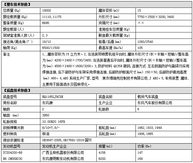 上裝配置:罐體容積:15立方,罐體鋼板采用Q235碳鋼鋼材,前沖后灑、側(cè)噴、平臺高炮、自流閥及消防接頭各1個、水管2根、標配大功率專用億豐泵或金龍泵,后平臺加裝30米、40米霧炮機組;其他標配。